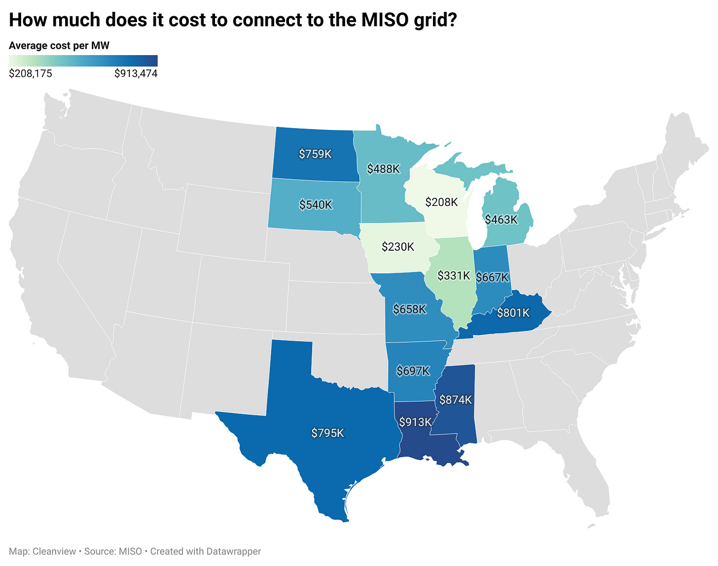 High-voltage transmission construction has plummeted from 4,000 miles in 2013 to just 322 miles in 2024—less than one-tenth of the 5,000 miles per year needed. In MISO, average interconnection costs for cancelled projects hit $753,116 per MW—roughly half of a typical project’s total capital cost. Louisiana and Missouri, with costs exceeding $900k per MW, lost 26 GW of capacity combined in 2025.
