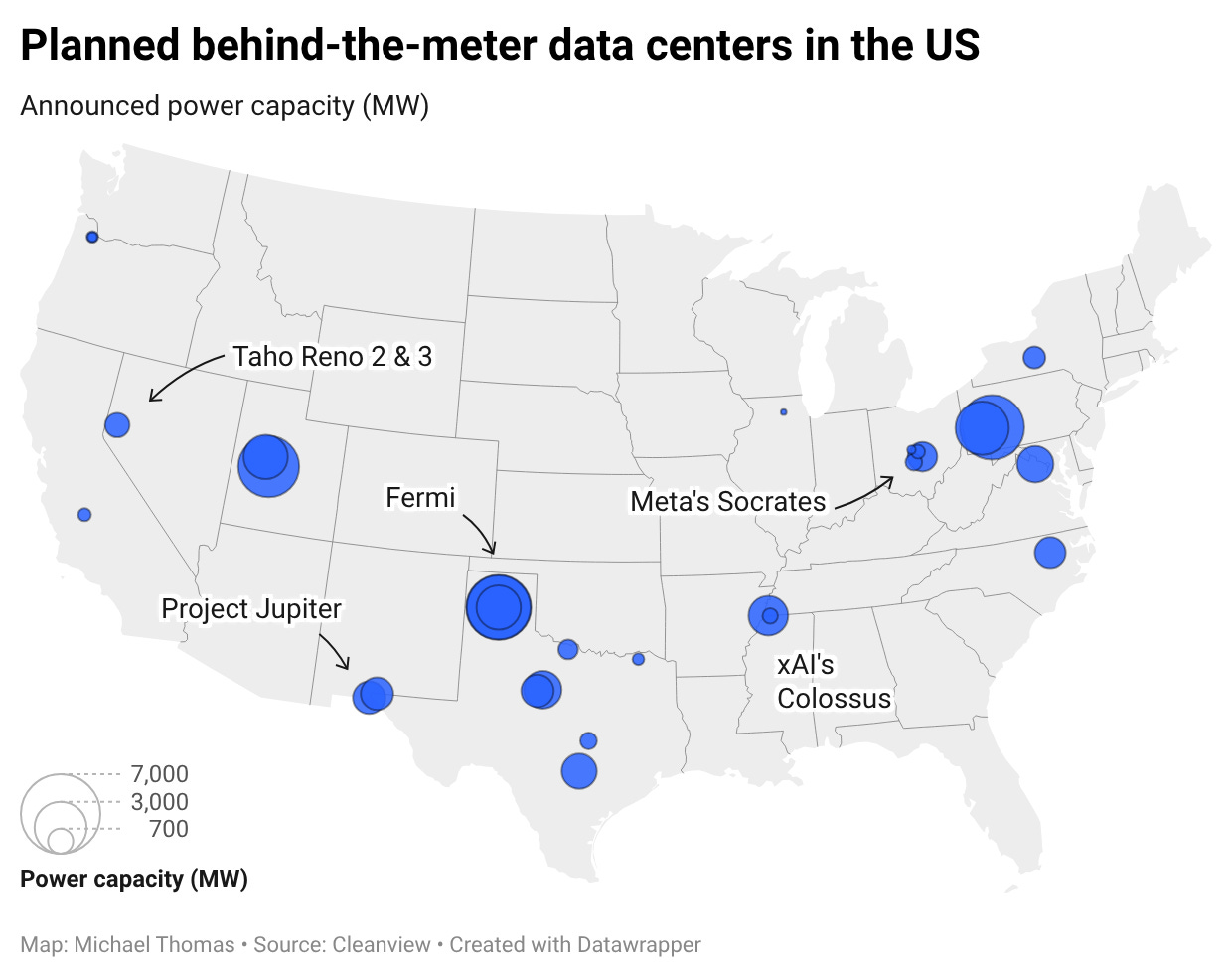 FT, Dec 2025: "Data centre developers are turning to onsite gas generation — where power does not come from the grid — to meet their deadlines. OpenAI’s Stargate facility in Abilene, Texas, is set to include 10 natural gas turbines with a capacity of 361MW. Meanwhile, planning documents outline Meta’s goal to add 200MW of this so-called behind-the-meter generation to its Prometheus cluster in Ohio."