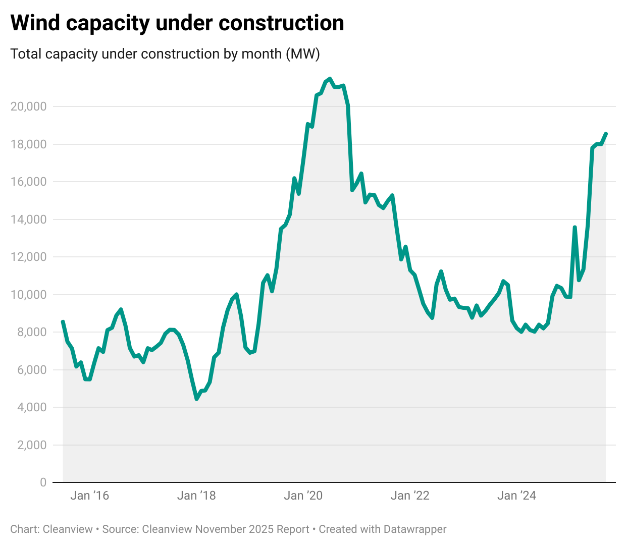 However, there are some signs of potential improvement. Wind capacity under construction has grown by 87% year-over-year to reach 18,543 MW as of September 2025. This has been driven primarily by mega-scale projects that have been in the works for years and are finally reaching construction.