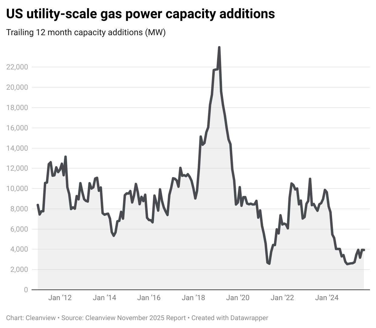 Natural gas capacity additions have shown modest recovery, growing 19% year-over-year to reach 3,937 MW over the last 12 months. However, this remains 84% below the March 2019 peak of 23,959 MW, reflecting the long-term decline of new gas plant construction.
