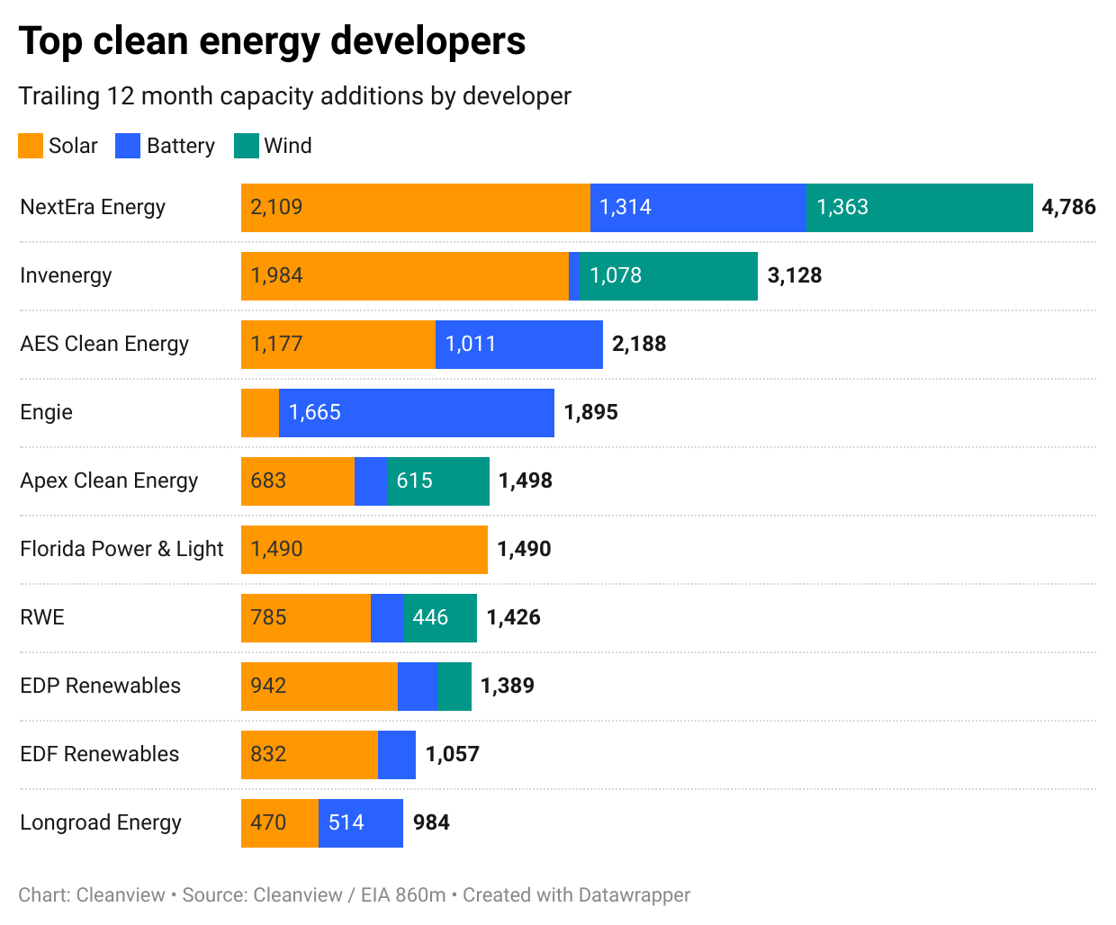Using our developer benchmark tool, we’ve ranked the top developers in the US across each technology. Here’s a summary for all clean energy technologies: