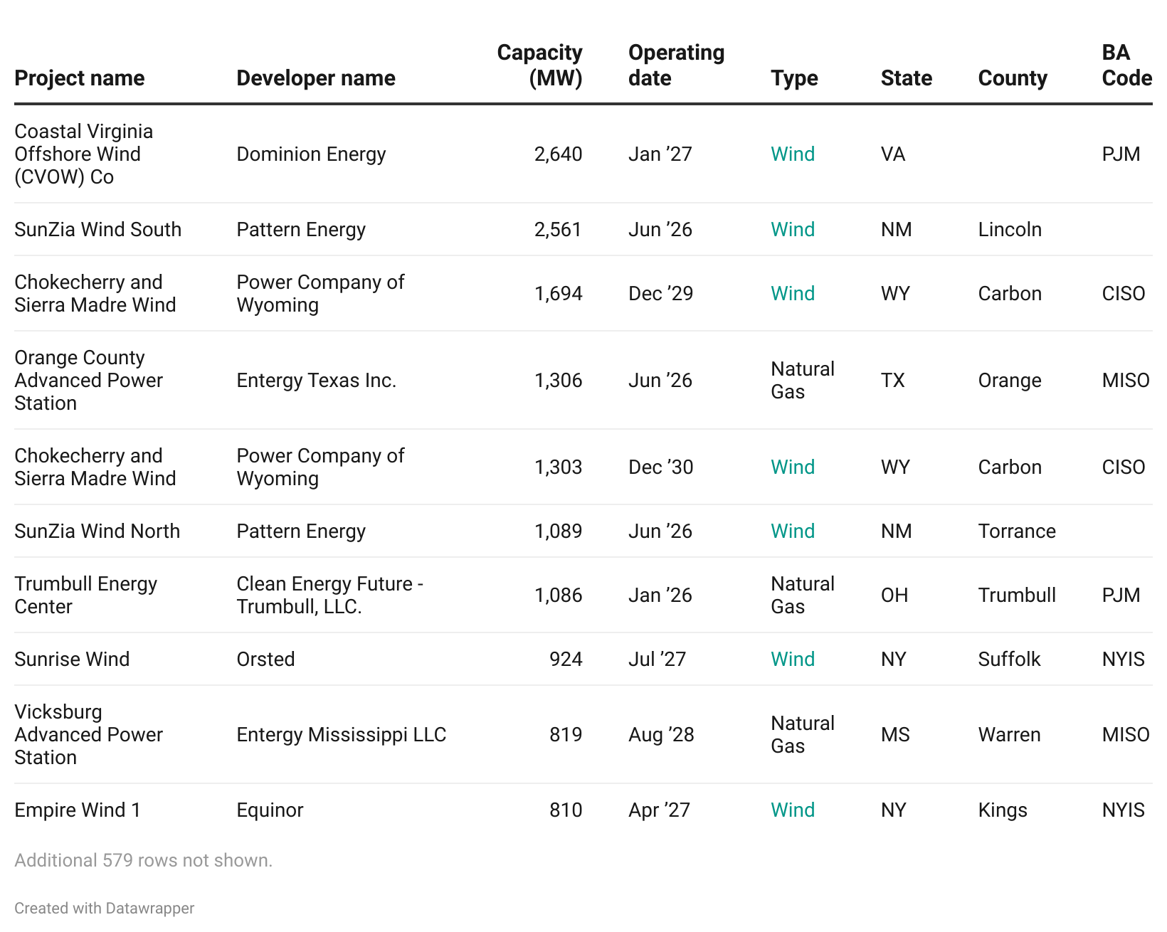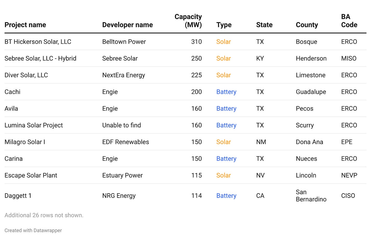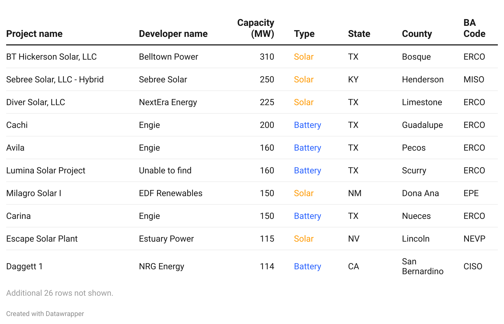 In the report, you can also see recently built projects across different technologies. Here are the largest power projects that came online over the last month: