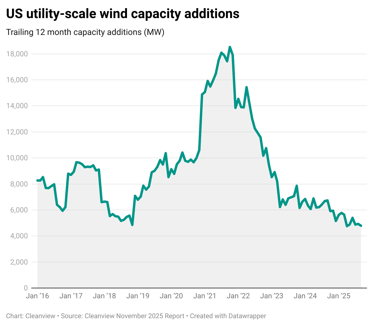 The wind industry continues to struggle in the US. Wind capacity additions have fallen by 74% since their October 2021 peak, when the country added 18,526 MW. Over the last 12 months, the US added just 4,792 MW of new wind capacity—a 29% decline compared to September 2024.