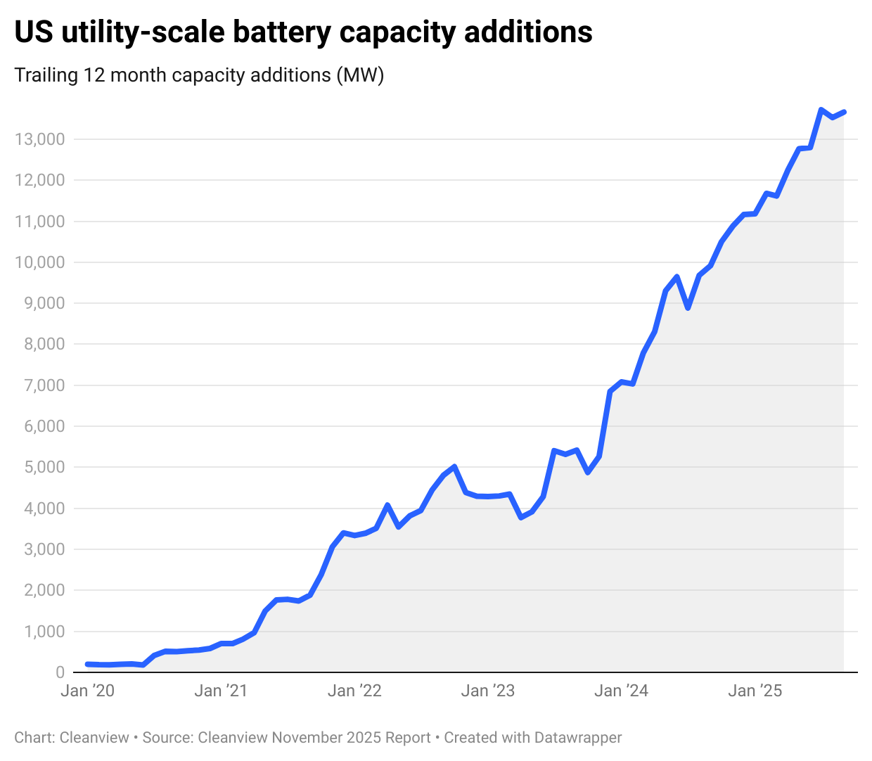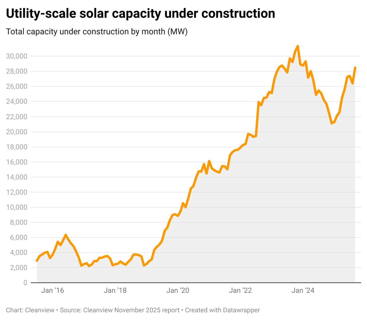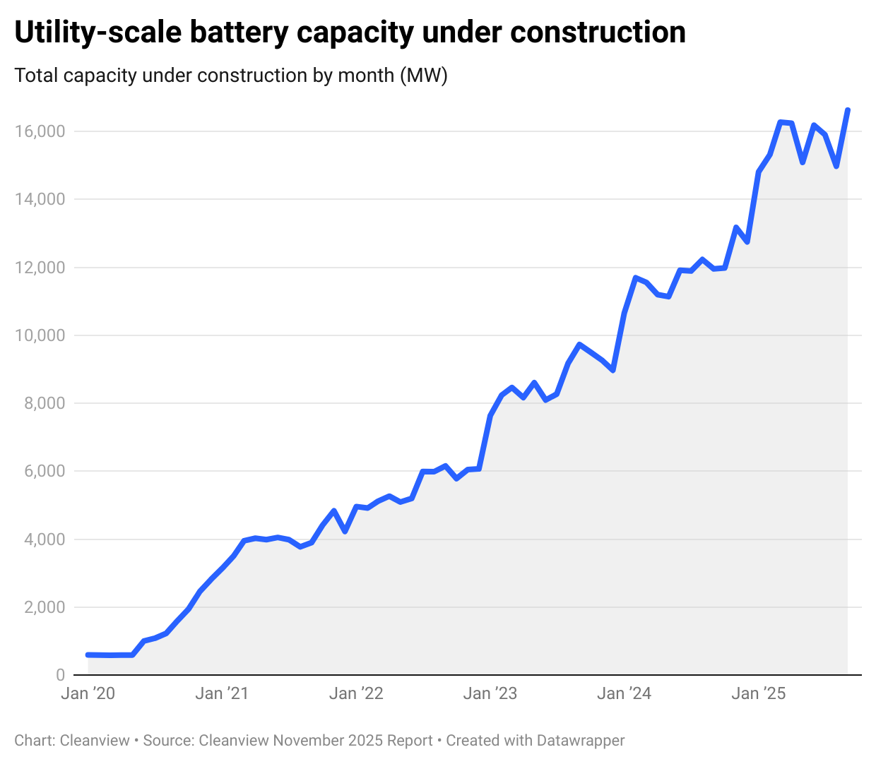 But here, too, things could be changing in the near future. Battery construction pipeline reached 16,626 MW as of September 2025—up 39% year-over-year—but has been relatively flat since March 2025.