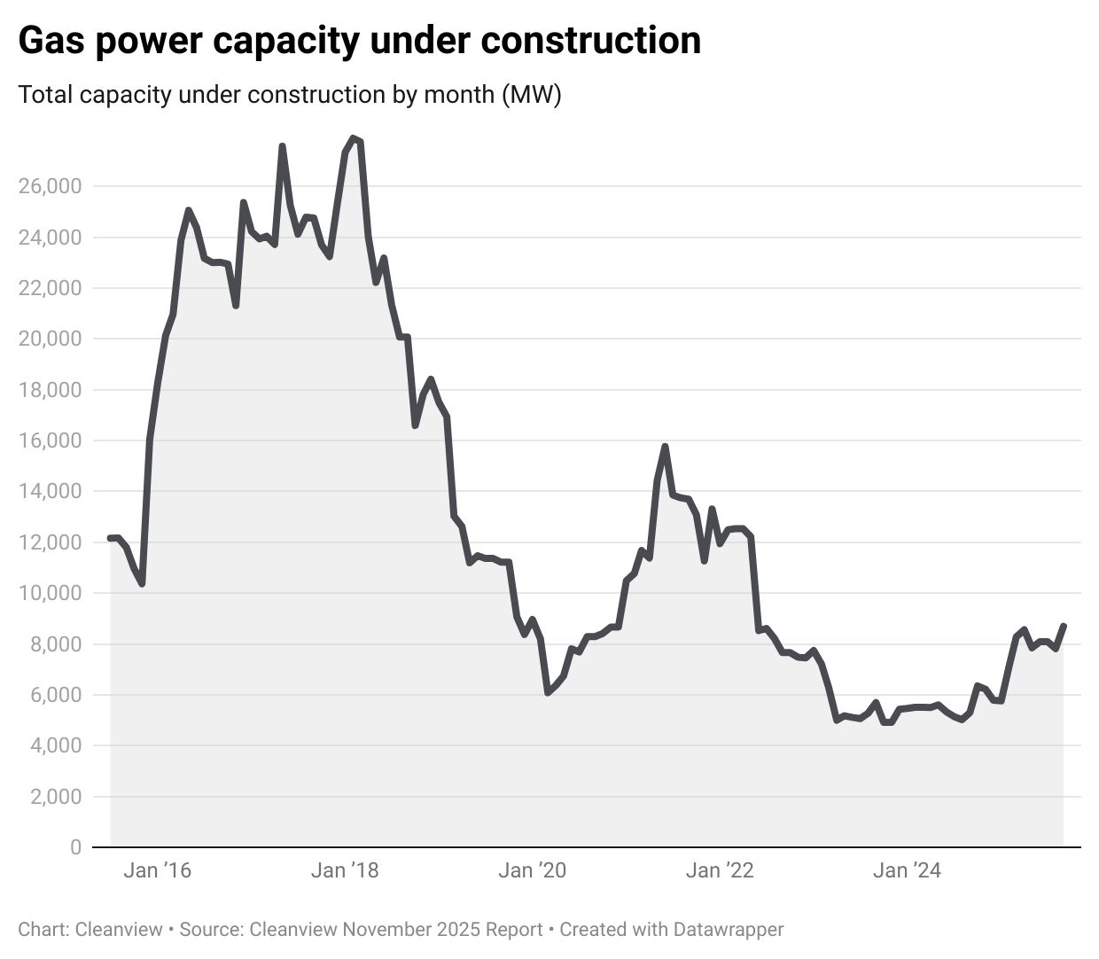 The construction pipeline tells a more interesting story. Gas capacity under construction has grown 64% year-over-year to 8,691 MW. Meanwhile, gas capacity across all stages of development we track has more than doubled in the last year.