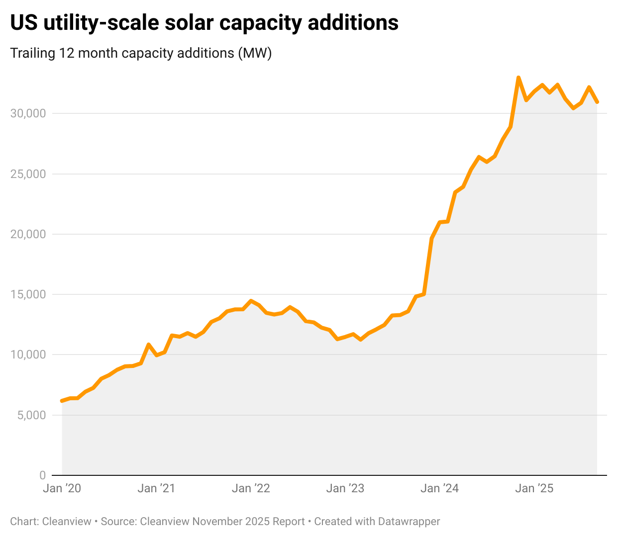 After years of double digit growth rates, annualized utility-scale solar capacity additions have actually fallen by 6% since the end of 2024, dropping from a peak of 32,982 MW in November 2024 to 30,965 MW over the last 12 months.